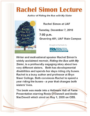 Writer and motivational speaker Rachel Simon (Riding the Bus with My Sister) will be in Fairbanks Tuesday, December 7th for a FREE daytime and a FREE evening event. PLUS, Simon will be the guest speaker at the FRA (Fairbanks Resource Agency) Annual Gala Wednesday, December 8th, 6:30 p.m. at the Westmark.